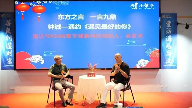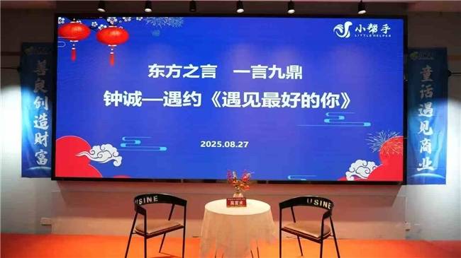 当室内屏幕两边的“童话遇见商业,善良创造财富”标语与第四期栏目主题“东方之言,一言九鼎”交相辉映,相互映衬。栏目主持人丽莉的主持风格也焕然一新,访谈老师钟诚质朴中透着深邃的唯美尽显其中,给第四期栏目的场域平添几分美好与灵动。